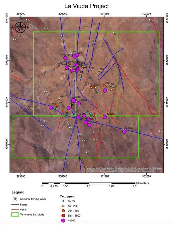 The La Viuda project is inserted in an elongated Mining Cluster approximately N15 ° W, following a regional structural trend, where there are mainly 9 porphyry copper deposits, such as the Llahuin Porphyry System (Llahuin, Cerro del Oro, Ferrocarril, South, North porphyries) owned by Southern Hemisphere Mining, the Llanos Porphyry owned by Hochschild and Gomila, the Tulio Porphyry owned by small miners, and La Viuda, Megalo and Megalo Norte? porphyries (Sociedad Contratual Minera Megalo)