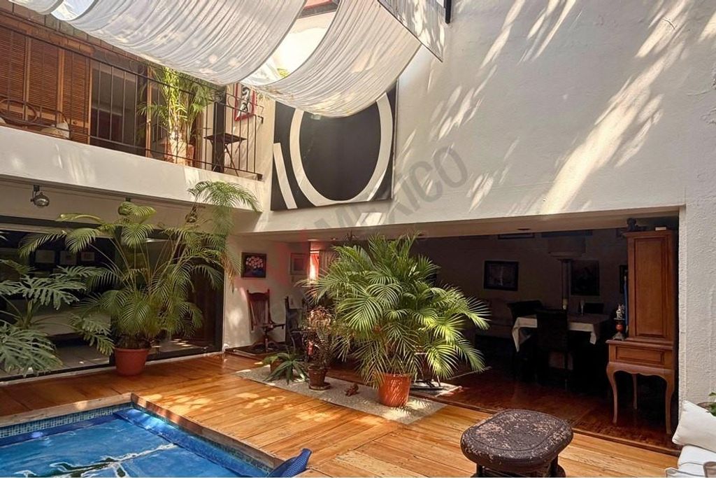 Stunning modernist home steps from Parque Hundido, designed with high, sloped ceilings that create a bright, open feel throughout. A central pool anchors the living spaces, connecting the double-height dining room, glass-covered lounge, and outdoor living areas. The main level features a serene primary suite with skylit bath, plus two bedrooms that share a full bath and offer direct access to the pool for seamless indoor–outdoor living. Upstairs, two additional rooms share a full bath and enjoy soft, filtered light from the glass-roofed pool below. The independent kitchen includes tall cabinetry, built-ins, a skylight, and a breakfast nook with patio views. A basement houses storage and pool systems, supported by a solar water heater. An upper-level private loft offers its own living area, kitchenette, full bath, bedroom, and jacuzzi, ideal for guests or rental use.